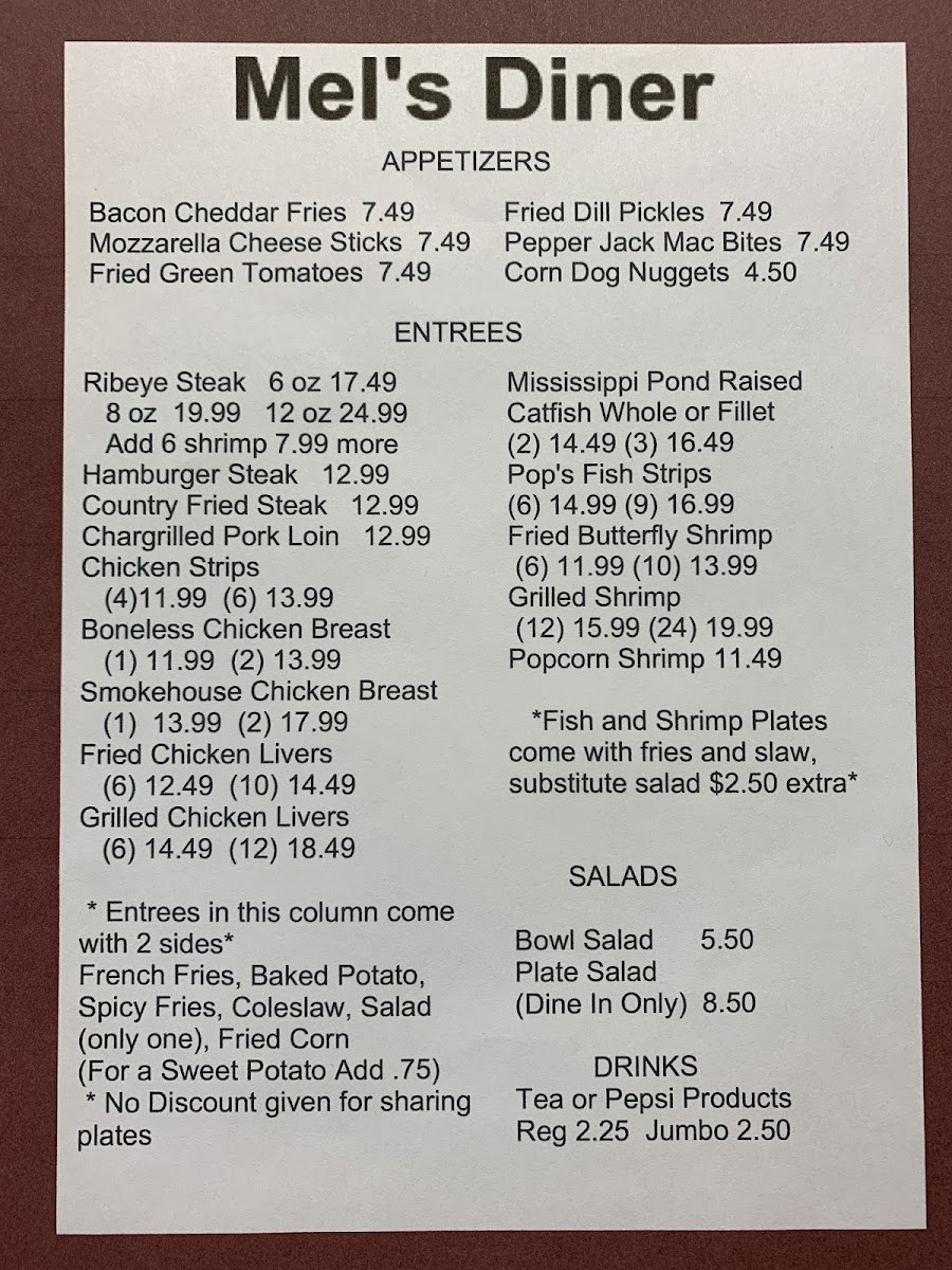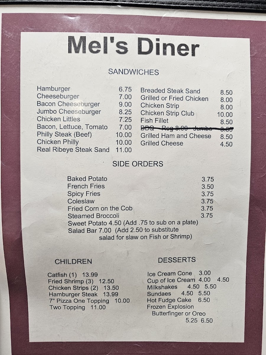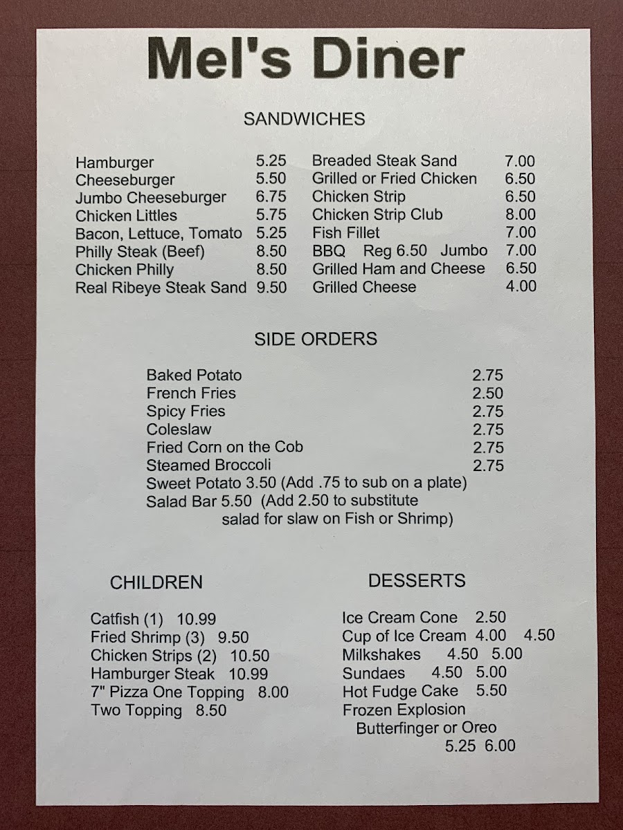 Families will appreciate the children’s menu, featuring kid-friendly choices such as Catfish, Fried Shrimp, Chicken Strips, Hamburger Steak, and 7" Pizza One Topping, ensuring there is something for every age. Finally, dessert brings the experience to a sweet close with simple, nostalgic treats like Ice Cream Cone, Cup Of Ice Cream, Milkshakes, Sundaes, and Hot Fudge Cake. Overall, the menu at Mel’s Diner feels cohesive and comforting, combining variety, tradition, and approachability into a satisfying conclusion that reflects the essence of a classic American diner.