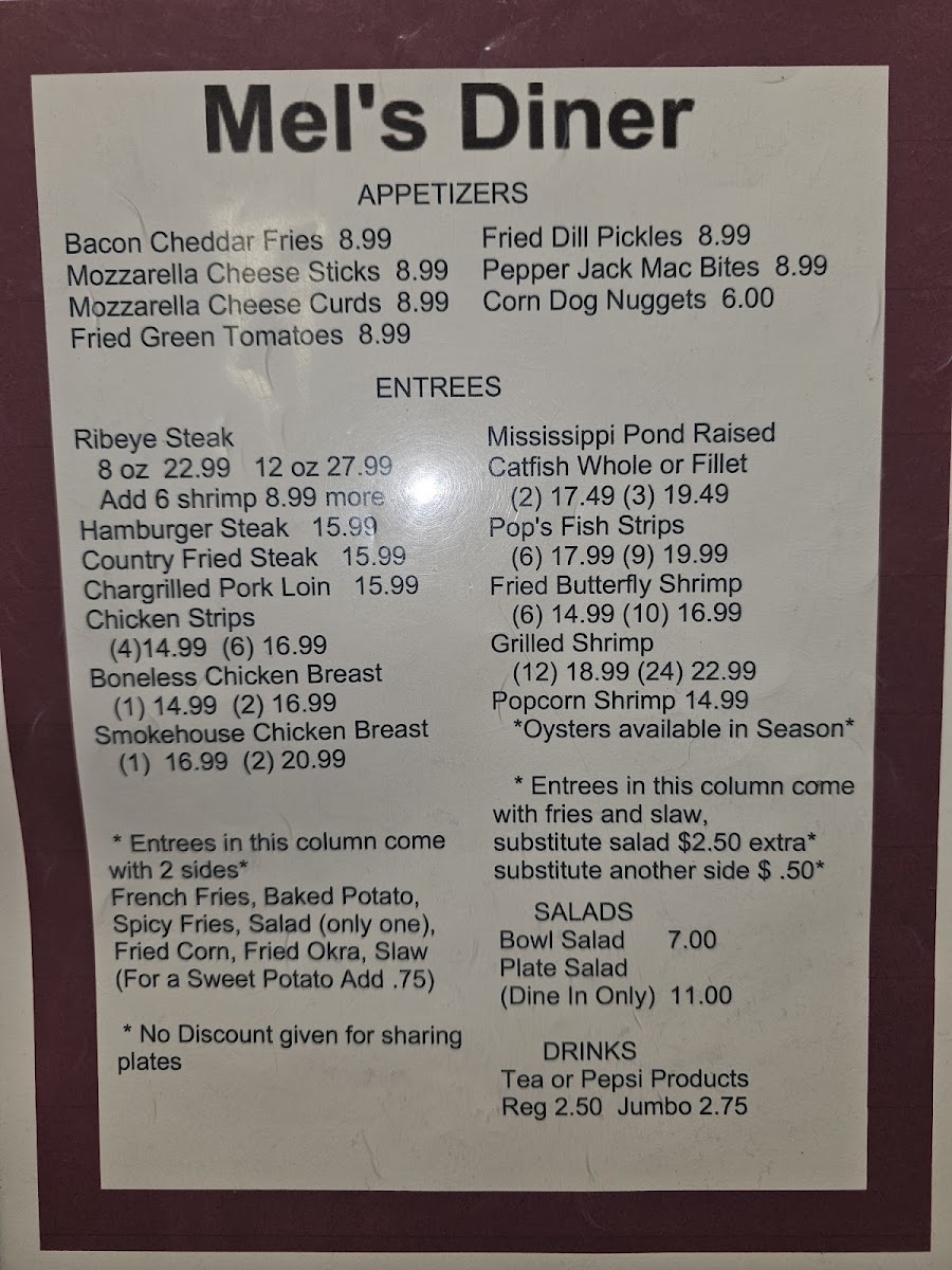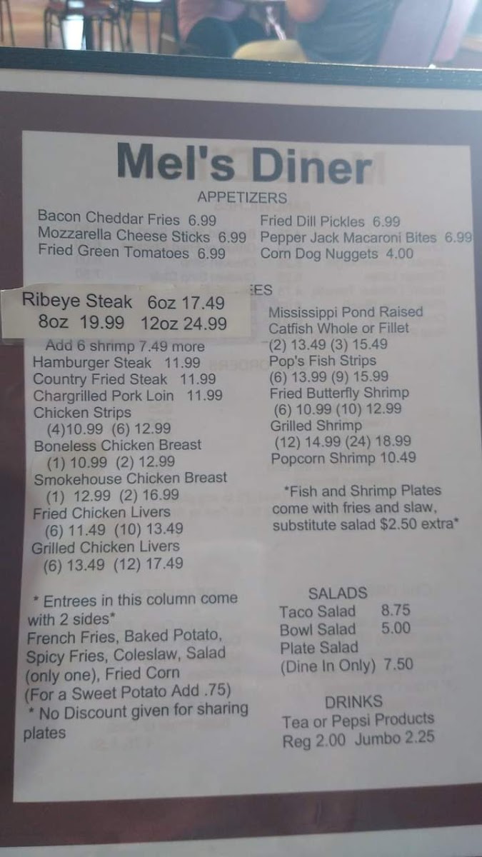 From a reviewer’s perspective, the menu at Mel's Diner delivers a well-rounded, comforting snapshot of classic Southern diner cuisine, making it easy to see why this spot resonates with locals. The meal can begin with satisfying appetizers like Bacon Cheddar Fries, Mozzarella Cheese Sticks, Mozzarella Cheese Curds, Fried Green Tomatoes, and Fried Dill Pickles, all of which set the tone with familiar, indulgent flavors. Moving into the heart of the menu, the entrée selection stands out for its variety and heartiness, ranging from Ribeye Steak and Hamburger Steak to Country Fried Steak, Chargrilled Pork Loin, and Chicken Strips, each reflecting the diner’s commitment to filling, traditional plates. Lighter options are still well represented through Bowl Salad and Plate Salad, offering balance for those seeking something fresh.